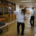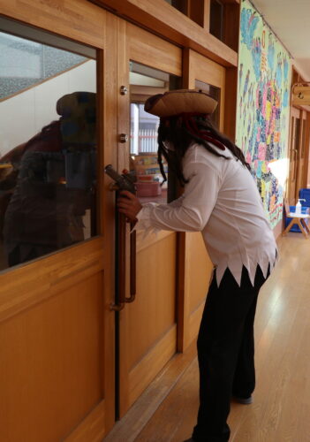 幼稚園に不審者が入ってきてしまったと想定し、避難方法を確認しました。(実際にこんな不審者はいないと思いますが…笑)